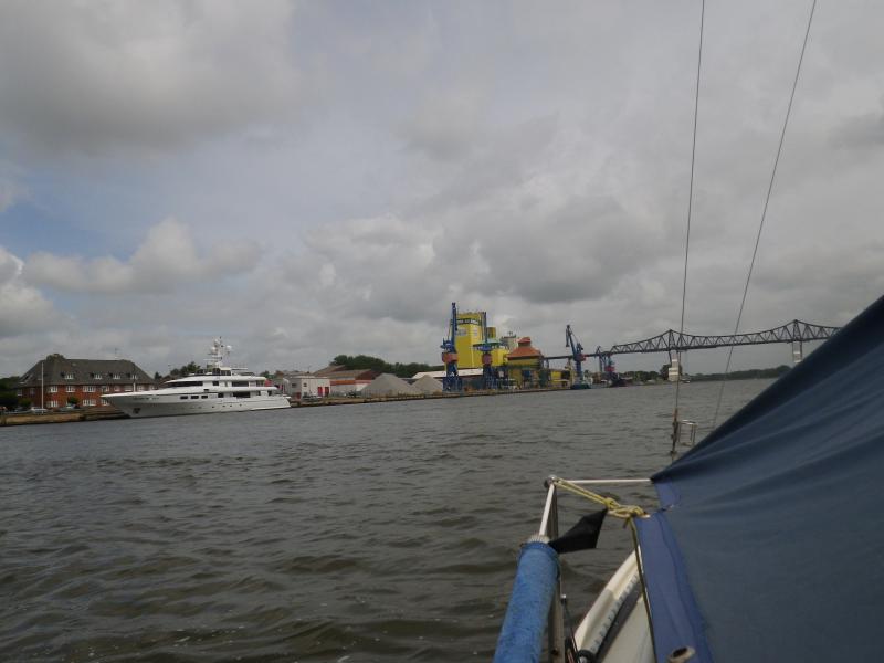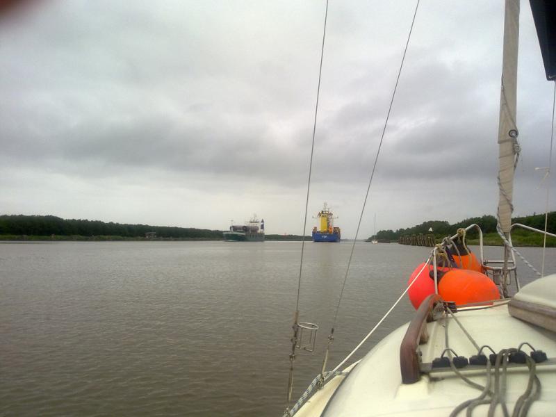 Kaum aus der Schleuse raus die erste Fähre. Mit der nächsten sind wir bei der Fahrt von Lars zum Hafen über den Kanal.
