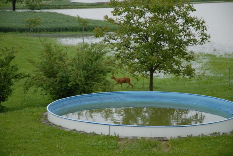 Bild 1) Eine Rehmutter sucht in unserem Garten Schutz vor den Wassermassen Bild 2) Ihr Rehkitz hat sie in einem Weizenfeld versteckt. Keine Angst, ich hab das kleine Geschöpf nicht berührt, sonst würde es ja von ihrer Mutter verstossen. Bild 3) Unsere Zufahrtstrasse, momentan nicht passierbar Bild 4) Ein Maisfeld vor unserem Haus, ca. 50 cm überflutet Der Pegel sinkt langsam, auchbei uns scheint teilweise die . Ich freu mich schon auf die Gelsen ![]() , die uns jetzt den ganzen Sommer über quälen werden !!