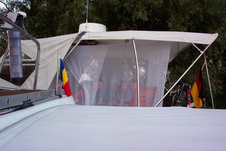 Günther, das Thema Mücken, war auch für mich schwierig. Es konnte mir eigentlich keiner Auskunft geben. Also haben wir uns sehr gut eingedeckt mit Mückenspray, nicht nur Autan, sondern auch was für die Tropen und zum Einreiben. Außerdem hatten wir, das haben wir aber immer, sämtliche Schlafzimmerfenster mit Mückegitter verschlossen, auch die Tür. Das Ruderhaus läßt sich durch die Kippfenster vorne und hinten und die Türen, die im Rumpf schräg sind, nicht so gut verschließen. Aber auf dem Achterdeck hatten wir ein Moskitonetz für die Tropen für ein Doppelbett, das hat ausgereicht.